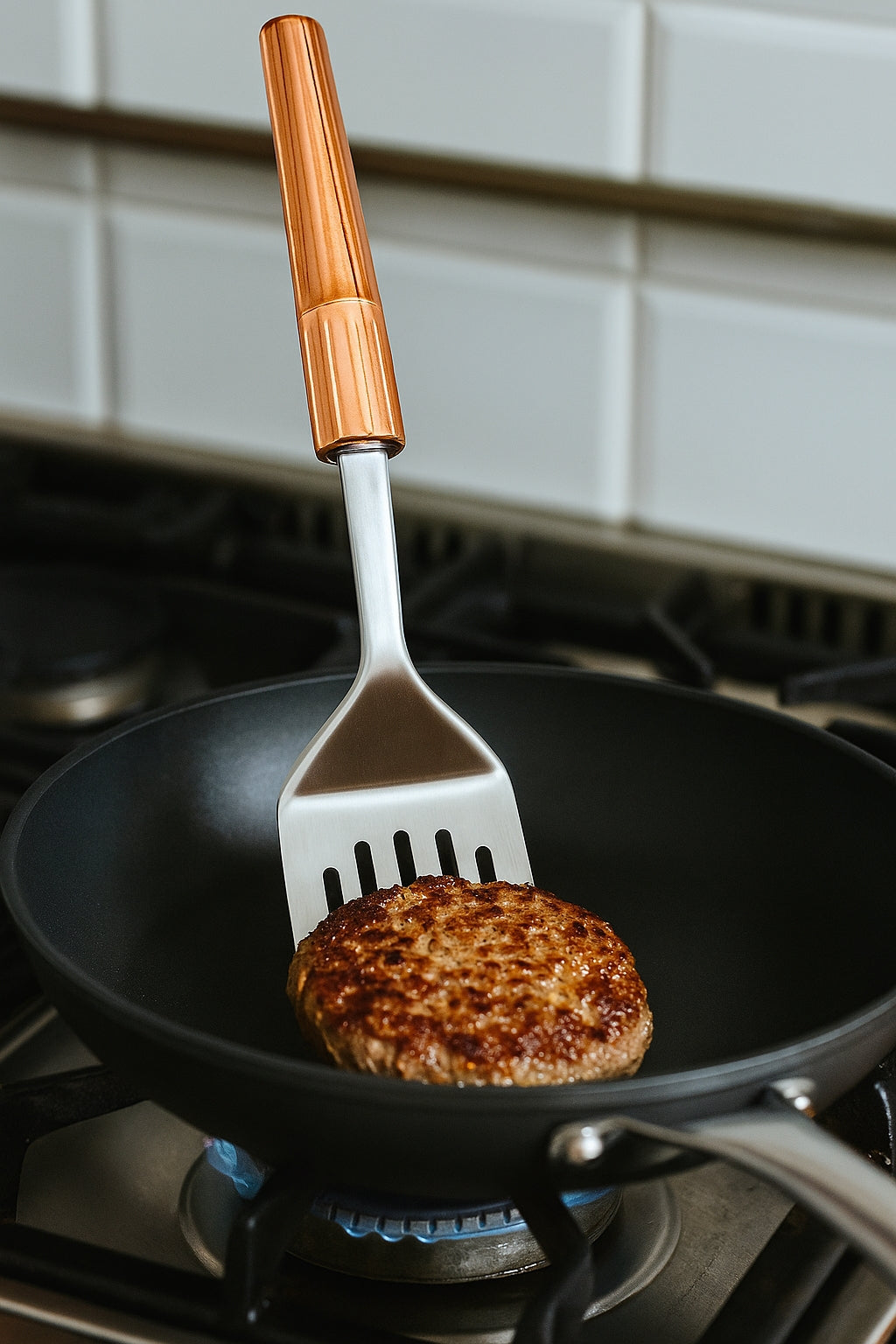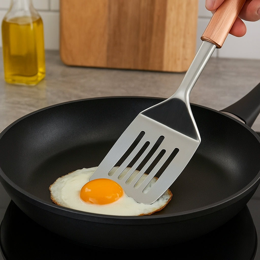 Confeccionada em aço inoxidável de alta qualidade, esta espátula garante resistência à corrosão, robustez e uma vida útil prolongada. Sua lâmina polida desliza facilmente sob os alimentos, tornando tarefas como virar panquecas, omeletes, grelhados e legumes uma experiência sem esforço e precisa.